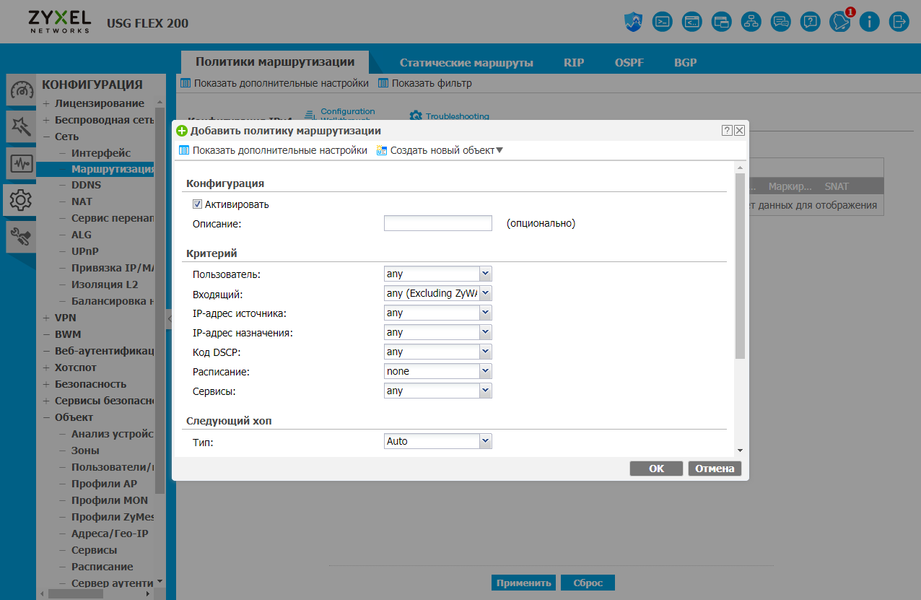 Для маршрутизации кроме статических маршрутов предусмотрены и политики маршрутизации, RIP, OSFP и BGP. Есть встроенный клиент DDNS, настройка правил трансляции портов, ALG, UPnP и другие сервисы.
