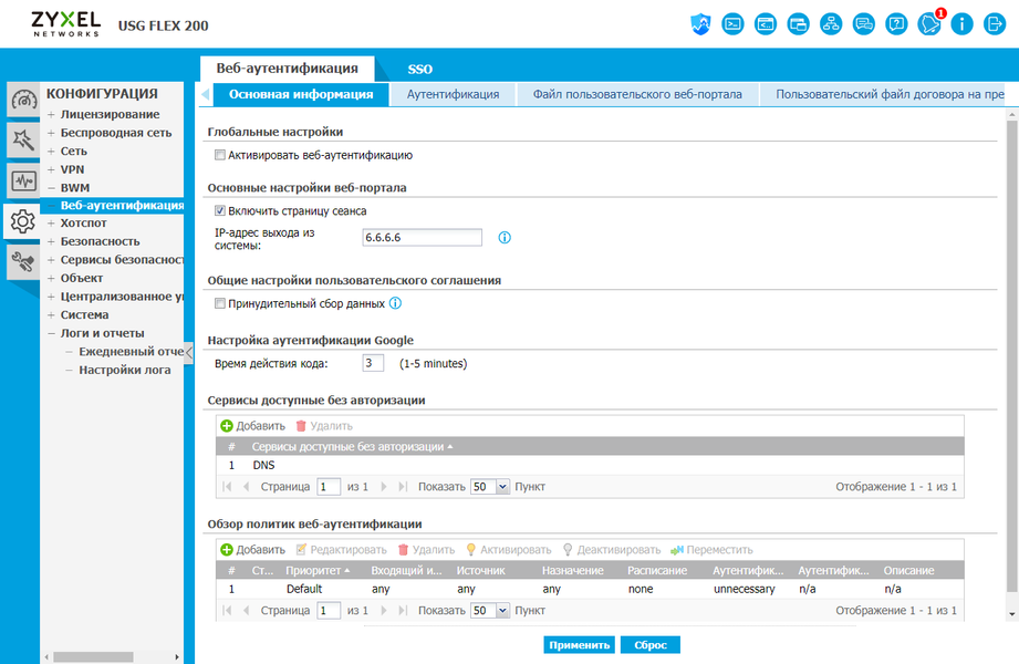 В шлюзе реализована встроенная систему аутентификации пользователей через веб-портал. При этом можно определить доступные без проверки ресурсы, создать несколько политик для аутентификации, загрузить собственный дизайн используемых в сервисе страниц.