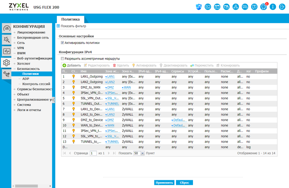 В разделе «Безопасность» настраиваются непосредственно политики обработки трафика NGFW. В каждой указываются различные правила для выбора соединений и к ним применяются настройки профилей контроля приложений, фильтров HTTP(S)/DNS и SSL-инспекции. Это одна из наиболее важных настроек основной задачи шлюза.