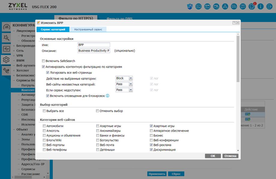 Аналогичным образом работают и фильтры HTTP(S)/DNS. Производителем уже предусмотрено два готовых профиля — для бизнес-пользователей и для детей. При необходимости вы можете создать собственный. Кроме выбора категорий здесь предусмотрены исключения в виде черного и белого списков. Настроенные профили также применяются далее к правилам политик.