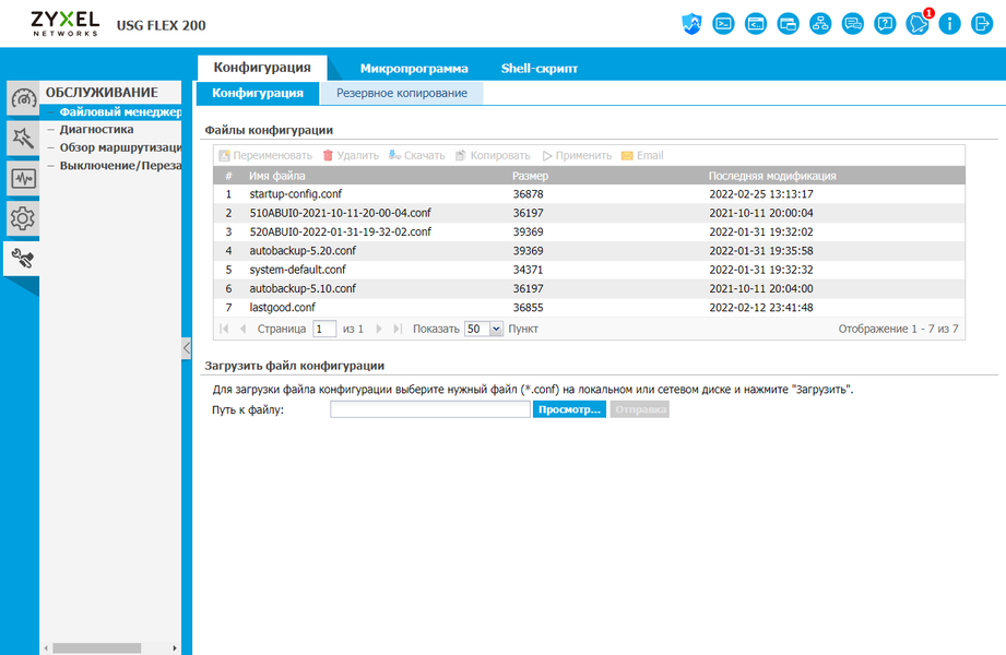 Последняя группа относится к операциям обслуживания шлюза. На странице управления файлами можно управлять конфигурациями (скачать, загрузить, активировать), обновлять прошивку (как и во многих «серьезных» сетевых решениях предусмотрено хранение и использование двух образов), а также работать со скриптами. Из интересного — возможность автоматической отправки активной конфигурации (настроек) по электронной почте с целью резервного копирования.