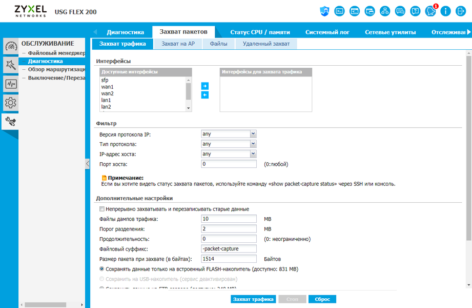 Есть здесь и богатые возможности для проведения диагностики сети. Кроме привычных утилит ping/traceroute/nslookup, есть функция захвата пакетов, подготовка отчетов для техподдержки.