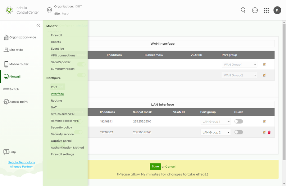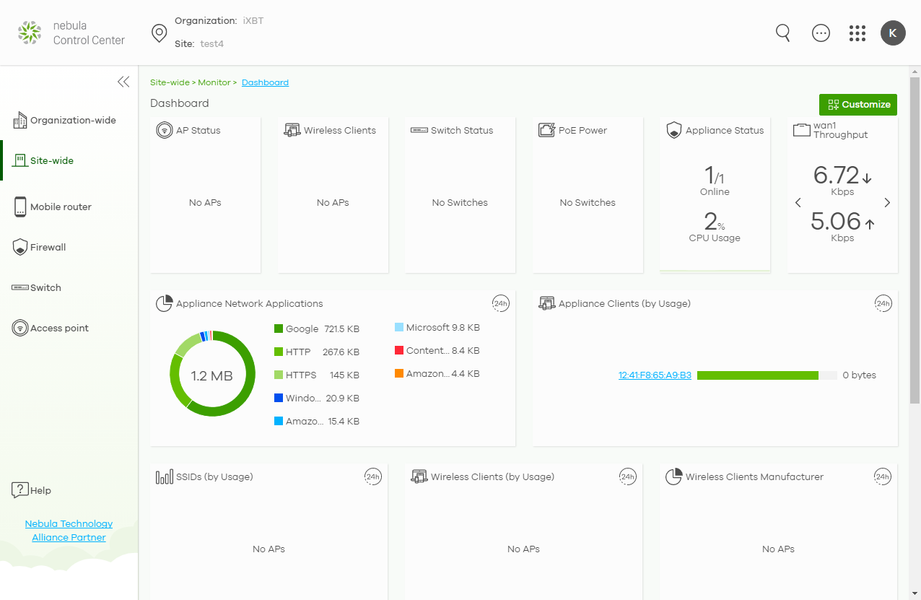 Рассматриваемое решение также может быть интегрировано с системой облачного управления Zyxel Nebula. Учитывая современные тенденции на удаленную работу и аутсорс, этот сценарий может быть удобен для многих компаний, независимо от их размера. При этом сервис позволяет из единого интерфейса контролировать работу достаточно сложных сетевых инфраструктур, включая шлюзы, коммутаторы и точки доступа. Отметим, что использование облачного управления несовместимо с локальным контролем через веб-интерфейс.