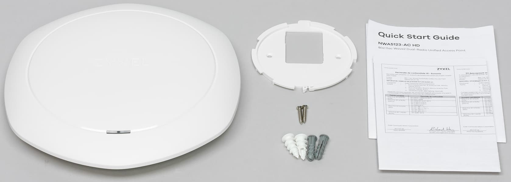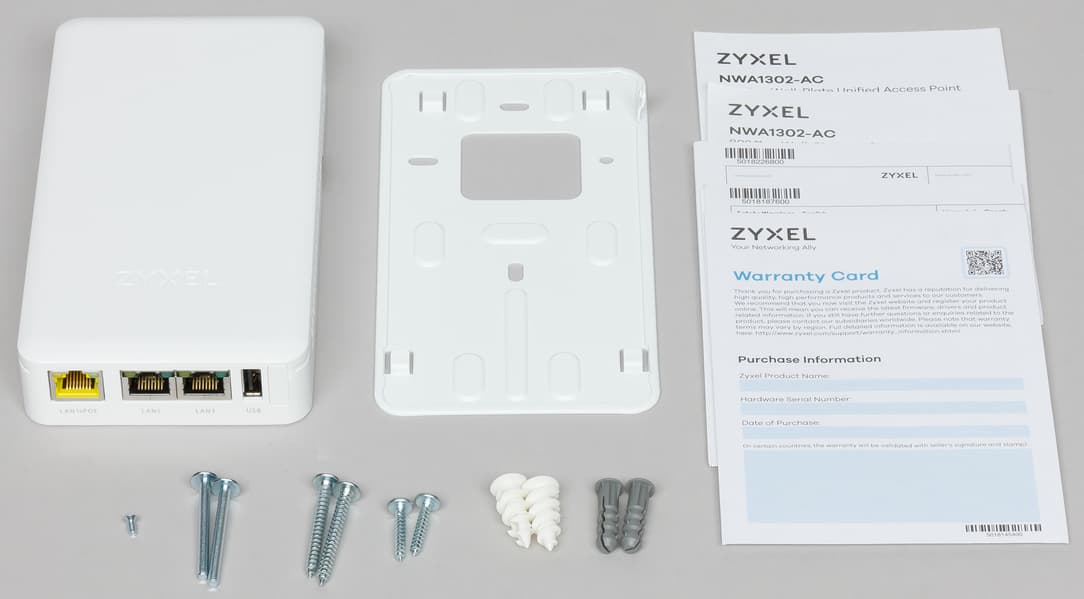Поставляется точка доступа в небольшой картонной коробке с простым оформлением. В комплект поставки входят пластина для крепления, набор винтов и шурупов с дюбелями и краткая инструкция по установке и началу работы.