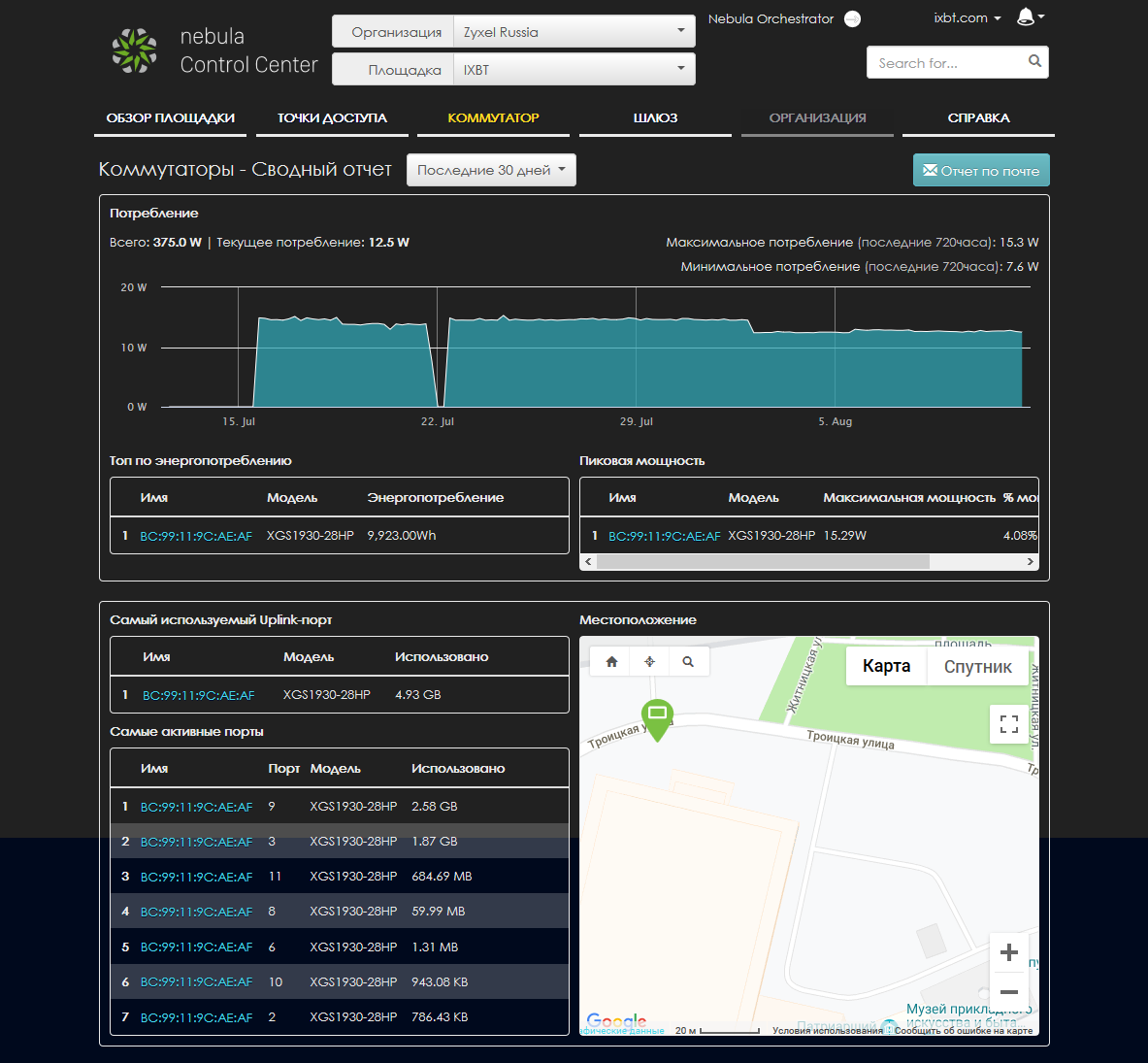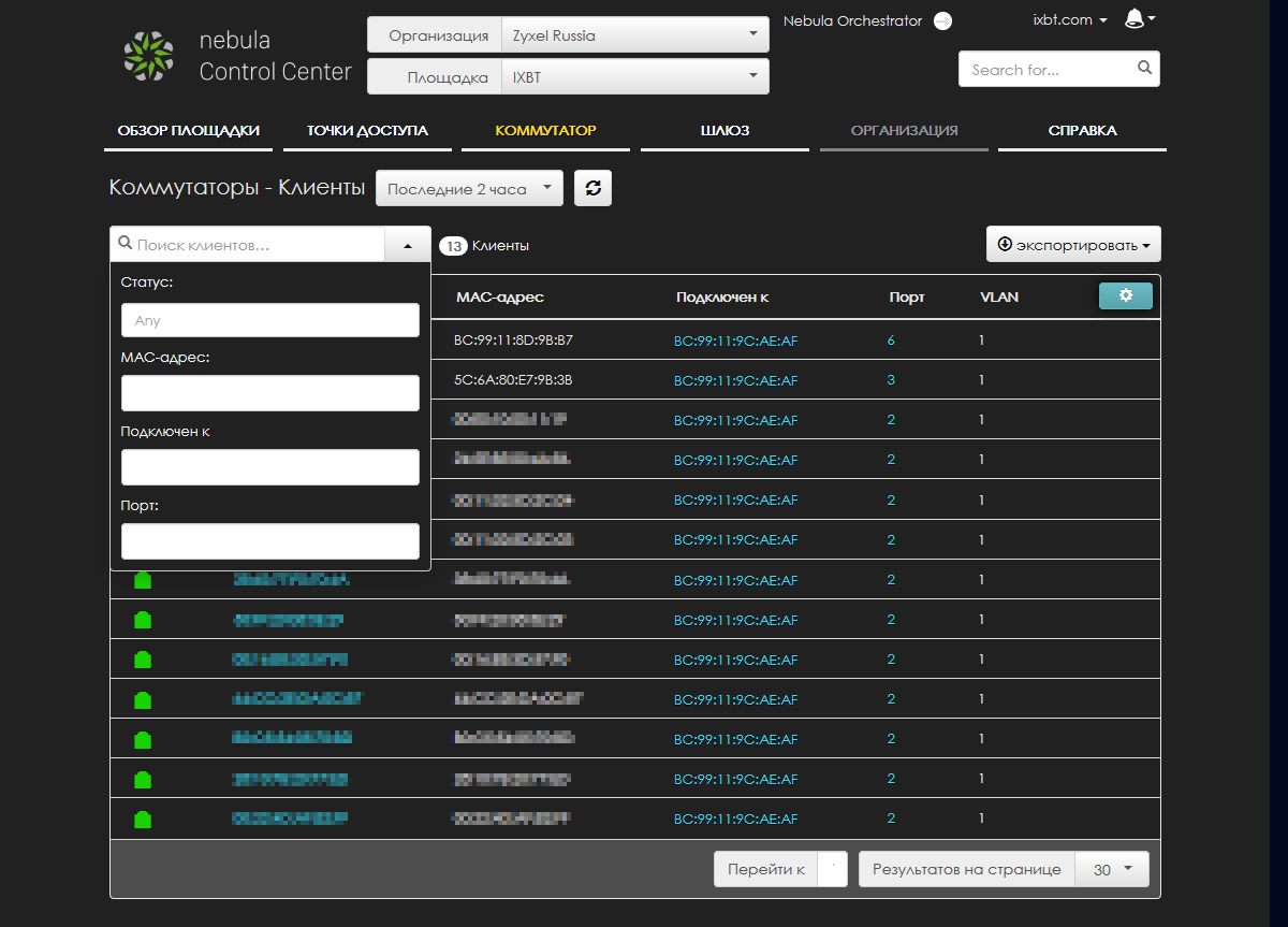 Посмотрим, какие возможности по работе с тестируемым коммутатором доступны в облаке Nebula. В соответствующем меню есть две основные группы страниц — «Мониторинг» и «Конфигурация». Для начала можно посмотреть список всех подключенных к данной площадке устройств.