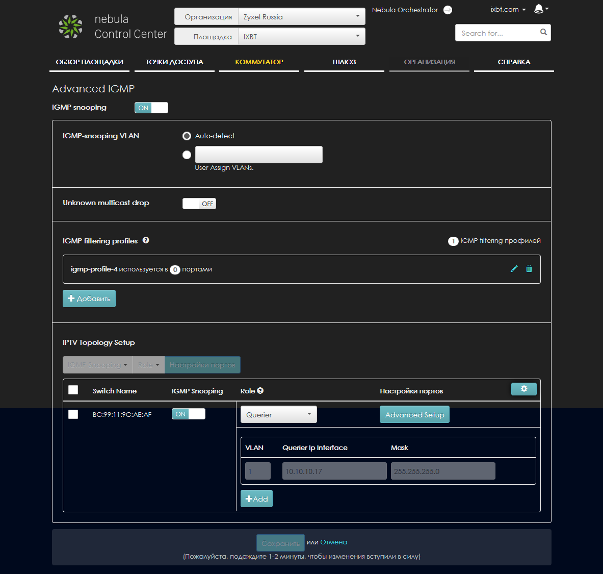 Некоторые из возможностей настройки обработки и фильтрации IGMP-трафика представлены на странице «Advanced IGMP». Здесь можно включить функцию IGMP Snooping для конкретных коммутаторов, выбрать их роли, настроить фильтры мультикаст-адресов для дальнейшей привязки их к портам или коммутаторам.