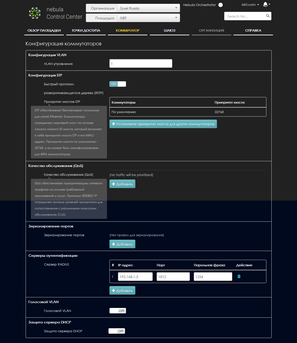 Некоторые общие параметры для всех коммутаторов площадки настраиваются на странице «Конфигурация коммутаторов». В частности здесь можно настроить приоритеты для работы протокола STP, добавить QoS на базе 802.1p для трафика VLAN, включить зеркалирование портов, указать сервера RADIUS.