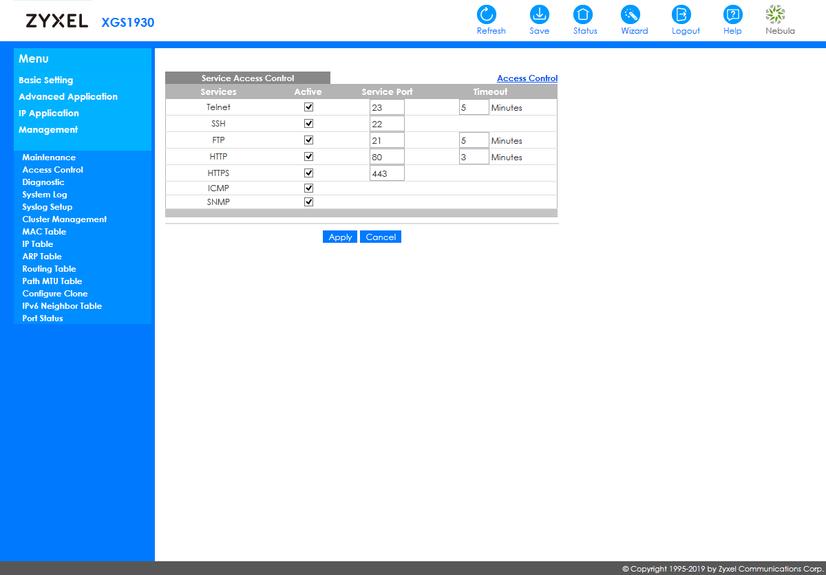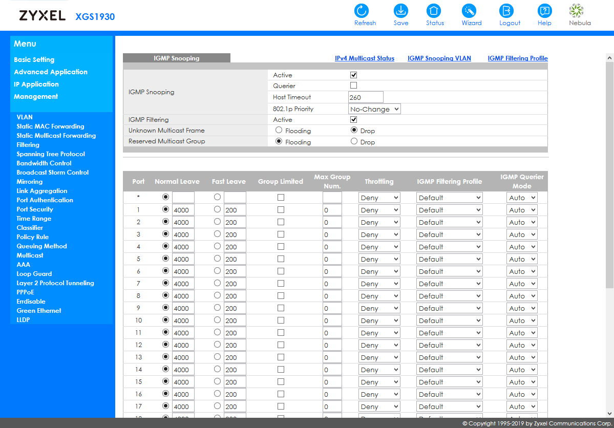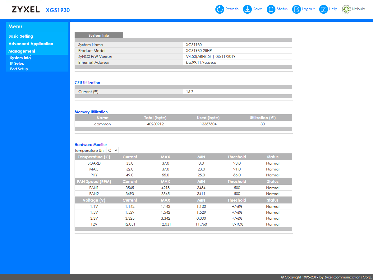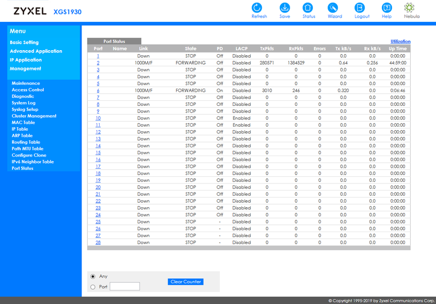 При интеграции в сторонние системы мониторинга будет пригодится поддержка устройством протокола SNMP (включая v1, v2c и v3, распространенные MIB и расширенный MIB Zyxel). Кроме того, здесь реализован RMON и отправка событий на внешние сервера Syslog.