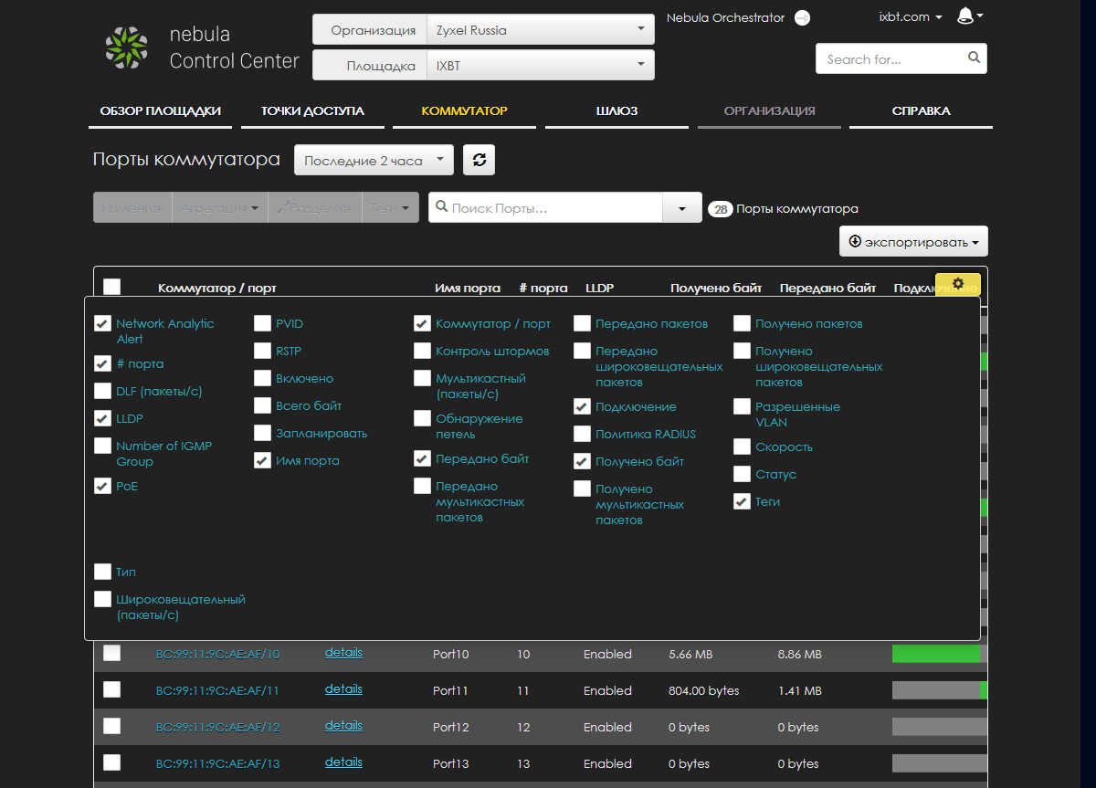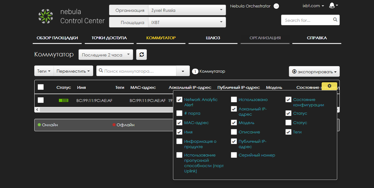 При необходимости можно выбрать нужные для отображения поля. Базовый набор информации о коммутаторе включает в себя статус подключения к облаку, модель, MAC- и IP-адреса, внешний адрес устройства, наличие обновления прошивки.