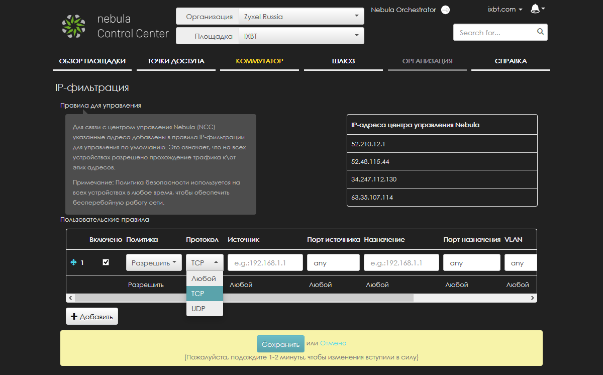 Страница «IP-фильтрация» позволяет запрограммировать в коммутаторах площадки правила фильтрации трафика на уровне IP. Обычно такая функция встречается в маршрутизаторах. В каждом правиле указываются такие параметры как адрес источника и получателя, протокол, порты, VLAN. Использование этих фильтров может пригодиться для дополнительной защиты.