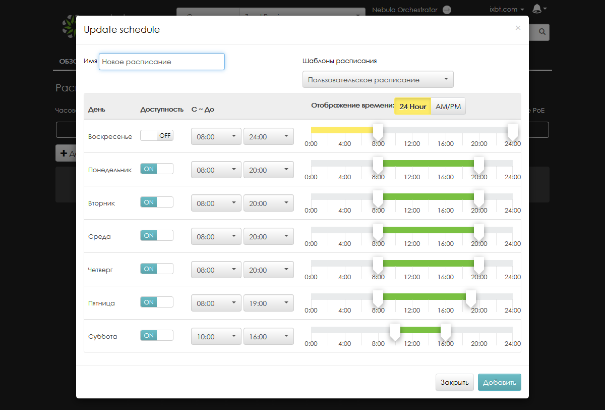 В некоторых случаях будет востребована возможность установки расписания работы PoE. Например, можно отключать точки доступа в нерабочее время для снижения риска взлома. При этом для каждой площадки можно настроить несколько расписаний, а потом назначать их конкретным портам коммутаторов. Для корректной работы расписаний, конечно, нужно не забыть установить часовой пояс.
