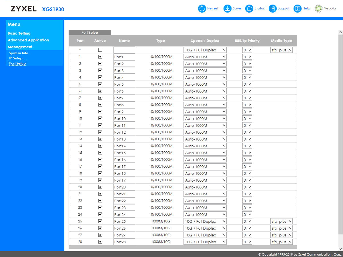 - настроить скорости и приоритет (802.1p) портов, отключить порты;
