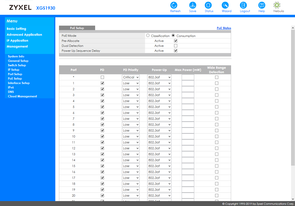 Заявленное потребление устройства составляет 15,5 Вт. Решение поддерживает PoE и по стандарту 802.3at и по стандарту 802.3af, однако во втором случае можно использовать только один из диапазонов. С точки зрения конфигурации сети, решение отвечает корпоративным стандартам: можно создать до 16-ти SSID, поддерживаются VLAN, IPv6, SNMP, списки контроля доступа, RADIUS/Microsoft AD/LDAP и многие другие функции. Для настройки может быть использован веб-интерфейс, специальные фирменные программы, облачная технология Nebula и даже CLI.