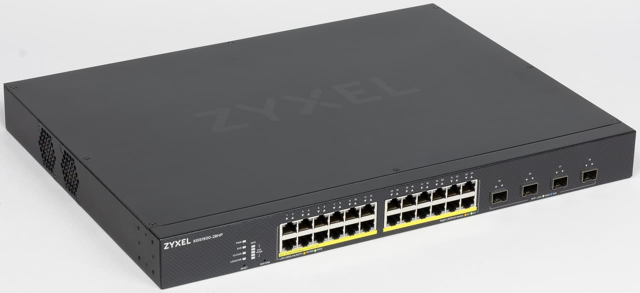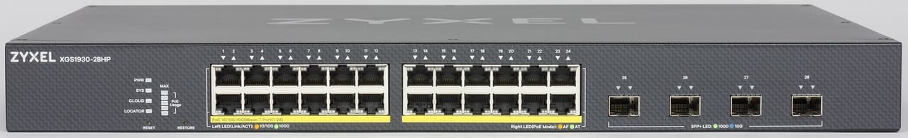Сетевой коммутатор Zyxel XGS1930-28HP является характерным представителем оборудования данного класса — управляемым гигабитным коммутатором уровня L2+ на 24 порта с четырьмя портами SFP+. Наличие поддержки соединений 10 Гбит/с позволяет исключить узкие места и обеспечить максимальные скорости во всех конфигурациях. Дополнительным пунктом идет поддержка современных стандартов PoE. Кстати, если подача питания на удаленные точки не требуется, аналогичная модель без этой функции предлагается примерно в два раза дешевле. Что касается дизайна, отметим неплохую реализацию связанных с PoE индикаторов, что поможет оперативно оценивать состояние этой подсистемы.
