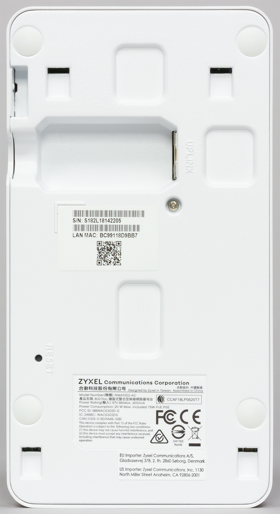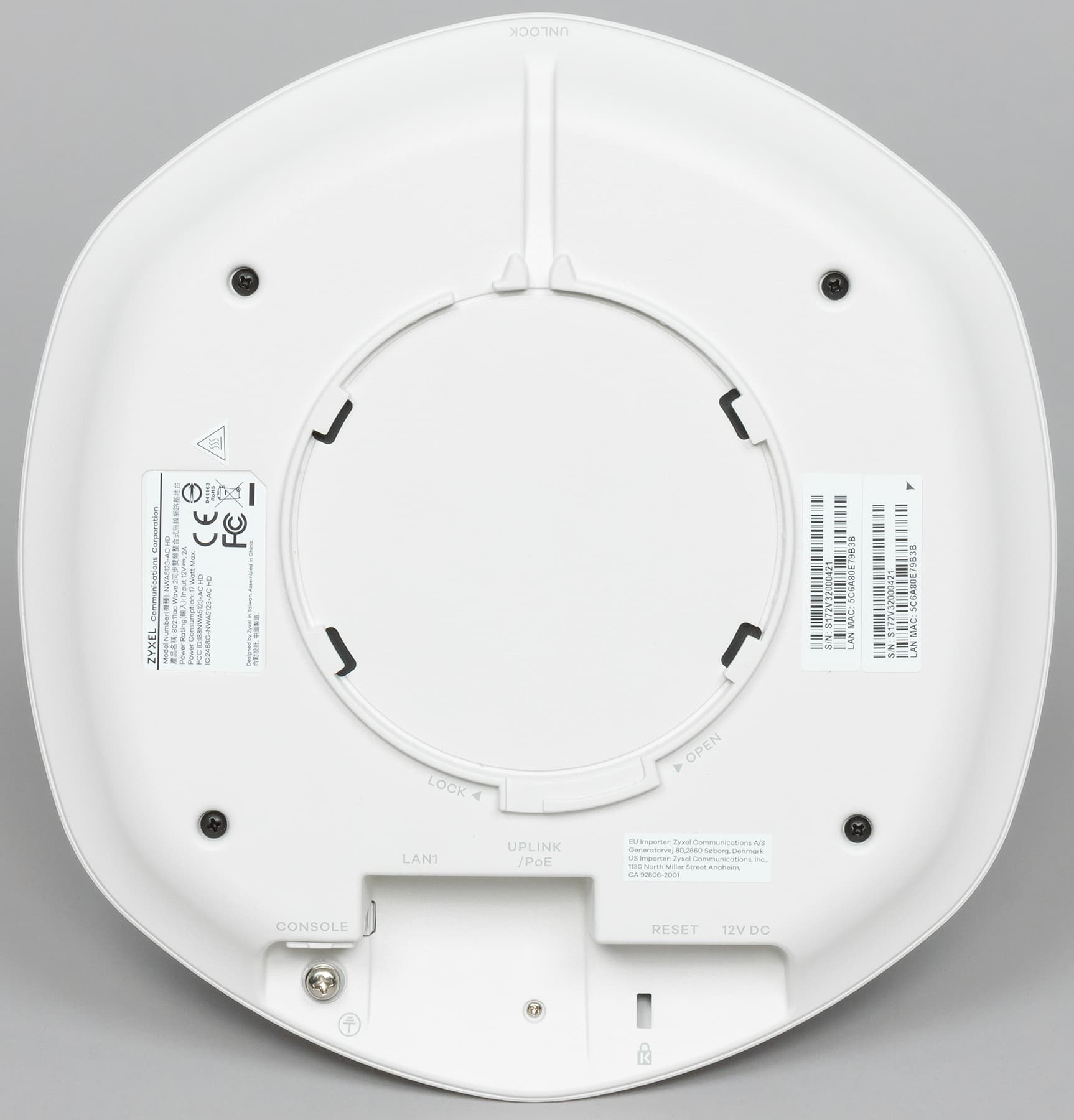 Крепление осуществляется через специальную переходную пластину из пластика. В ней есть два отверстия для шурупов, а точка доступа закрепляется путем поворота и держится на защелке. Никакой дополнительной фиксации винтом не предусмотрено. Демонтировать точку можно без специальных инструментов. Нужно будет только отжать защелку тонким длинным предметом. На нижней стороне точки доступа предусмотрена наклейка с ее серийным номером и MAC-адресом. Точнее даже две — одна постоянная, а вторая может быть легко отклеена для отчетности.