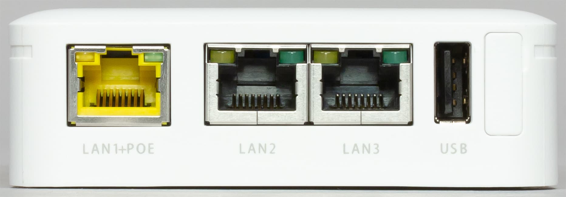 В нише спрятаны два гигабитных сетевых порта — один с поддержкой питания PoE на вход, второй для подключения следующего оборудования (уже без проходного питания). Оба порта имеют светодиодные индикаторы для упрощения диагностики.