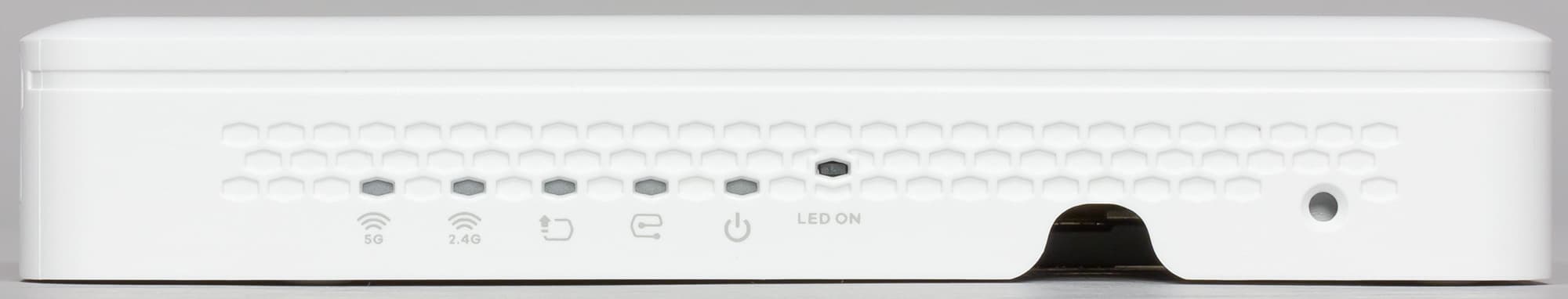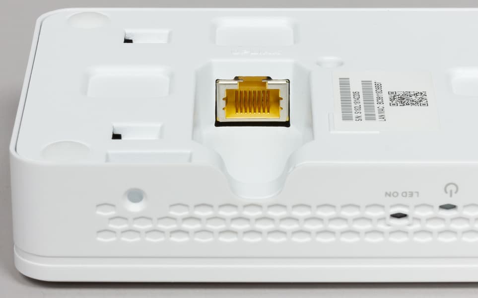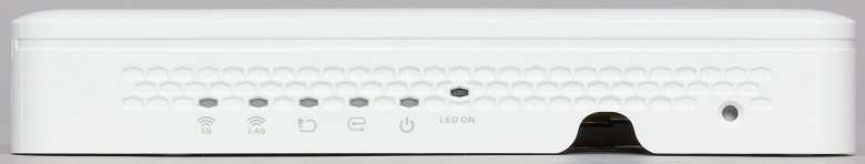 Расположенный в нише входной гигабитный порт является единственным способом подачи питания на точку доступа по технологии PoE. Индикаторов он не имеет, что, впрочем, компенсируется блоком из шести светодиодов на правой вертикальной стороне корпуса. На дне можно также заметить скрытую кнопку сброса настроек и информационную табличку с серийным номером и MAC-адресом точки доступа.