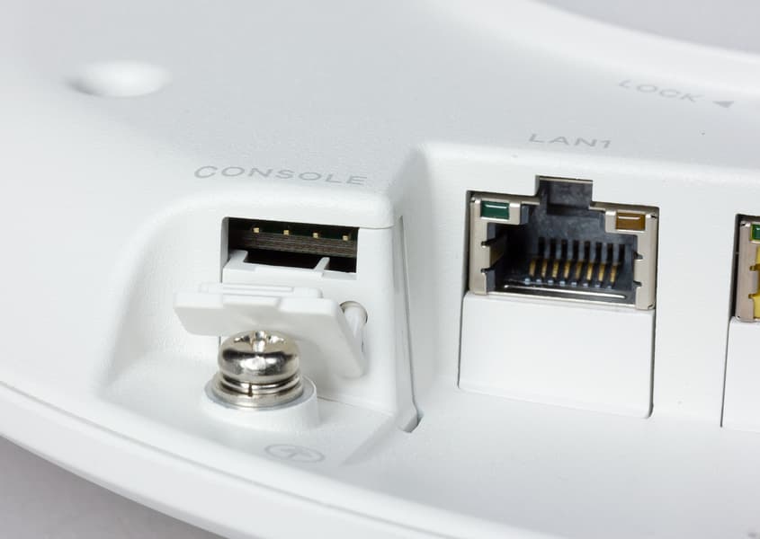 Слева от ниши есть служебный консольный порт, не предназначенный для использования конечным потребителем. Справа установлена скрытая кнопка сброса, альтернативный вход для подачи питания (12 В 2 А) и отверстие кенсингтонского замка. Обратим также внимание на винт для провода заземления.
