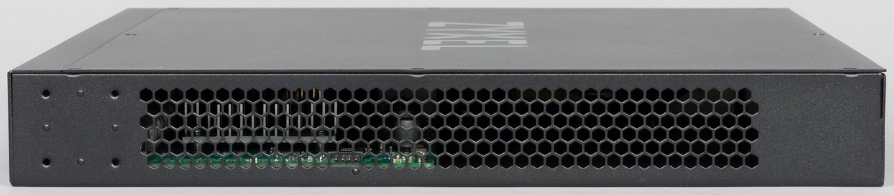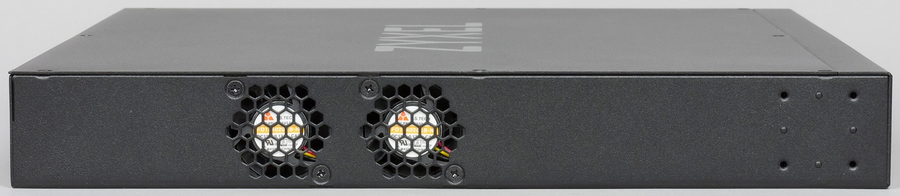 На правой стороне корпуса находится решетка для поступления воздуха, а на левой — два небольших вытяжных вентилятора. Учитывая наличие четырех портов 10 Гбит/с и встроенного блока питания для PoE — это вполне ожидаемое решение. Вентиляторы отсутствуют только в младшей модели серии — на 24 порта и без PoE.