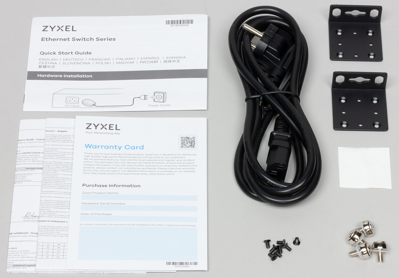 Коммутатор поставляется в крупной картонной коробке привычного для корпоративного сегмента простого оформления. Комплектация традиционная — коммутатор, кабель питания, крепление для стойки, резиновые ножки, комплект краткой документации и гарантийный талон.