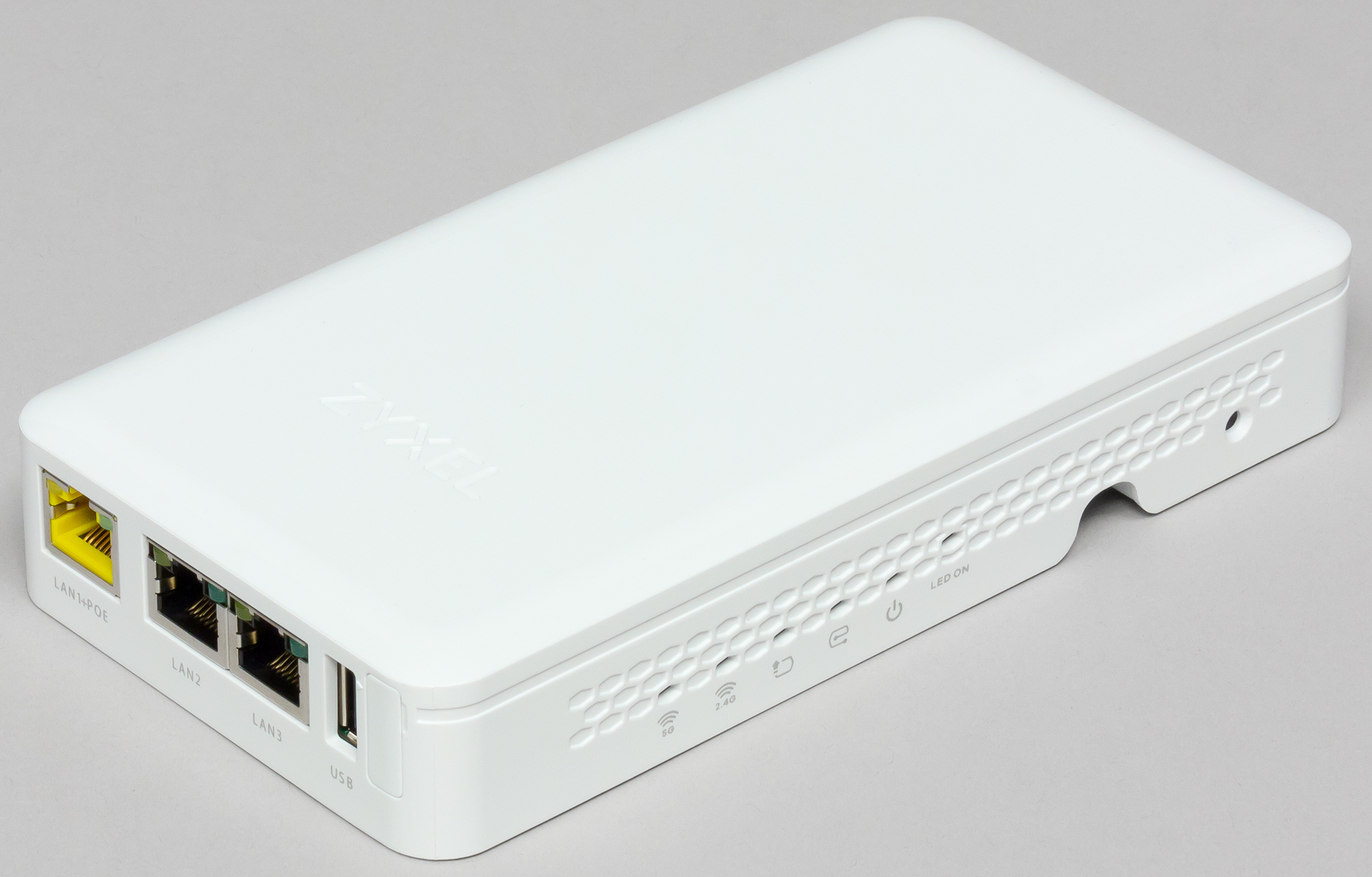 Но самое интересное расположено на нижнем торце — здесь есть порт USB 2.0, три порта LAN со встроенными индикаторами и служебный консольный порт. Все порты LAN позволяют подключить через точку доступа еще какое-то оборудование. Например, можно предложить сценарий установки точки доступа около телевизора с подключением к ней также медиаплеера и игровой приставки. При этом на всех потребуется подвести только один кабель. Заметим также, что один из портов LAN поддерживает PoE на выход, так что к нему можно подключить и IP-видеокамеру или IP-телефон.