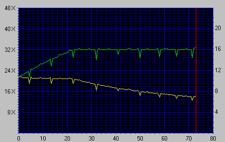 Как можно увидеть привод использует режим CAV для записи цианиновых и фталоцианиновых носителей. Приведенный скриншот записи CD-R производства компании Verbatim представляет наиболее типичную картину записи различных носителей, но если приводу диск не нравится, то для записи может использоваться технология P-CAV. Традиционно проводилось тестирование привода на способность корректно запиcывать цианиновые диски на минимальной скорости, такой режим чаще всего применяют меломаны, чтобы добиться максимально качественного звучания.