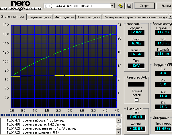 Максимальная скорость чтения — 16x достигается при чтении DVD-ROM и DVD+/-R дисков, при этом используется режим CAV.