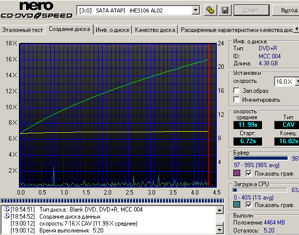Перейдем к дискам формата DVD+/-R, при записи дисков этих видов привод может развивать скорость до 16x. При записи дисков на максимальной скорости привод старается использовать технологию CAV. Проблем совместимости привода с болванками от различных производителей выявлено не было.