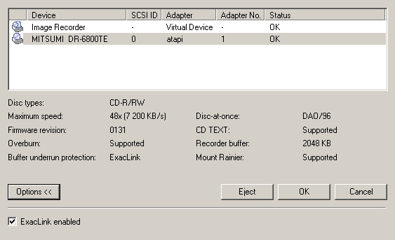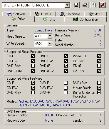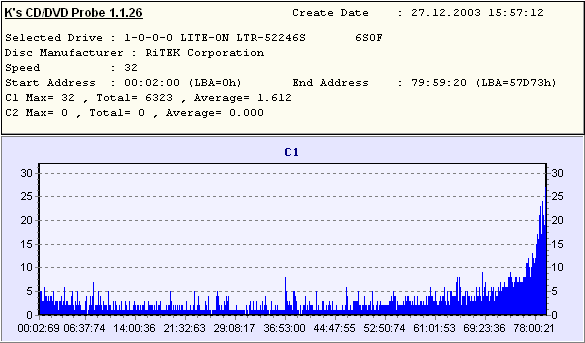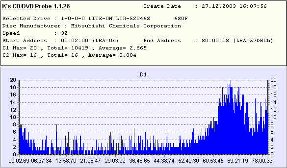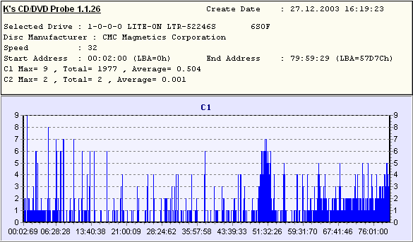 D-R CD-RW, CD, . , , , . , , . , . ATIP . Mirex 48xDisc Type = CDR (B-) Nominal = 702.83MB (79m 59s 74f/LBA:359849) Manufacturer = Plasmon Data Systems Ltd. Philips 52x Disc Type = CDR (A-) Nominal = 702.83MB (79m 59s 73f/LBA:359848) Manufacturer = RiTEK Corporation Verbatim 48x Disc Type = CDR (A+) Nominal = 702.83MB (79m 59s 74f/LBA:359849) Manufacturer = Mitsubishi Chemicals Corporation