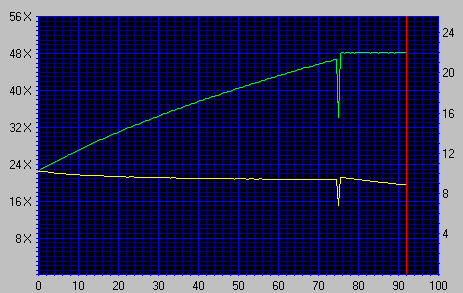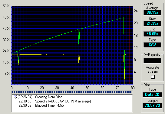 Как можно увидеть на скриншотах, привод достаточно четко делит все CD-R болванки на две категории, те которые он будет писать на скорости 48х и те, запись которых он может осуществлять только на скорости 32х. Небольшая неприятная особенность обнаружилась в процессе тестов, как можно увидеть время записи болванок на скорости 48х значительно выше, чем при записи на скорости 32х. Обьяснить это можно либо проблемами конкретного экземпляра привода, либо неудачно выбранной стратегией записи CD-R болванок на скорости 48х. На практике основные потери времени случались у привода в тот момент, когда он добирался до скорости 48х, на графике в этом месте можно увидеть большой провал, здесь привод около двух минут думал как поступить дальше. Иногда, это заканчивалось тем, что процесс записи вылетал с ошибкой, так что если у вас будет наблюдатся нечто подобное то лучше не рисковать и выбрать вместо 48х более низкую скорость записи, например 40х. Традиционно проводилось тестирование привода на способность корректно запиcывать цианиновые диски на минимальной скорости, такой режим чаще всего применяют меломаны, чтобы добиться максимально качественного звучания.