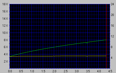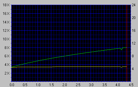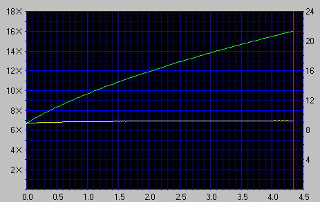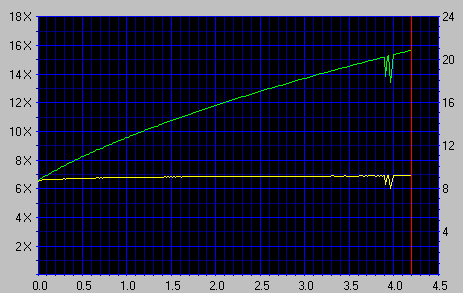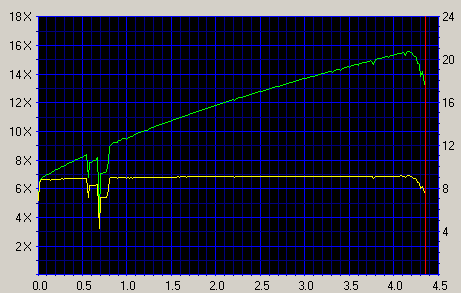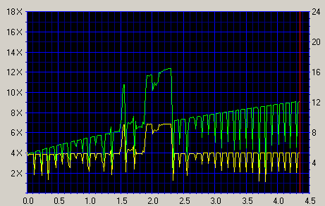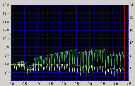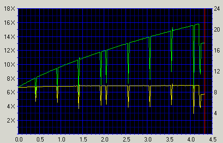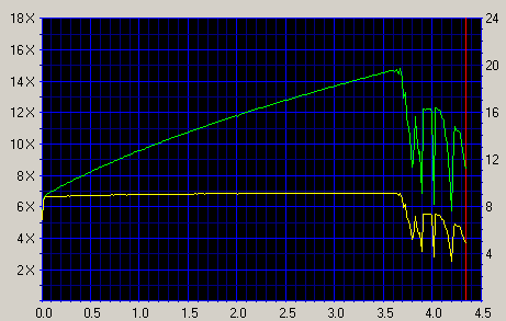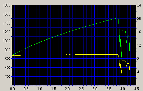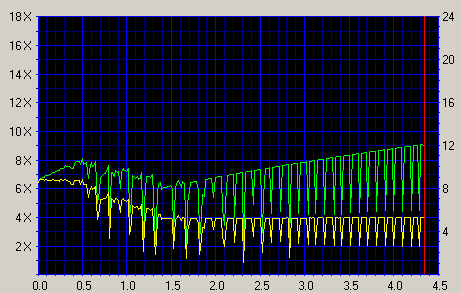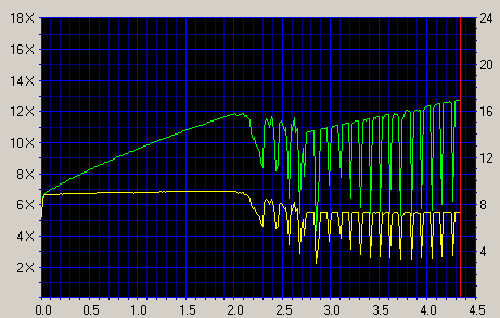 Как можно увидеть по результатам тестов, приводу нельзя рекомендовать носители Digitex, а с остальными дисками привод справился достаточно хорошо. Запись дисков DVD-RПри работе с DVD-R болваноками привод может развивать скорость до 16х, однако на нашем рынке пока не наблюдается болванок способных работать на такой скорости. У пользователя есть возможность записывать качественные DVD-R болванки на скорости выше номинала. При записи болванок формата DVD-R на скорости выше 6x привод использует технологию Z-CLV, а вот так процесс записи выглядит в графическом виде.