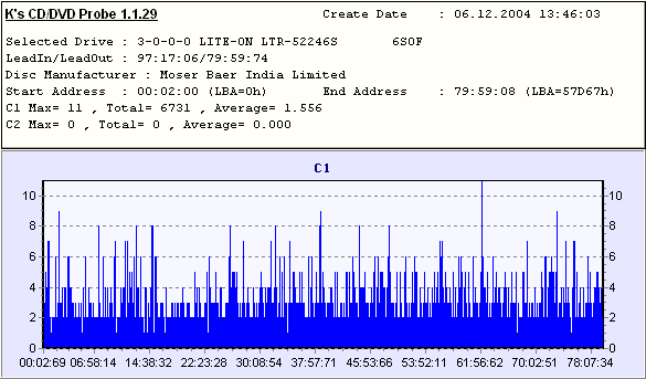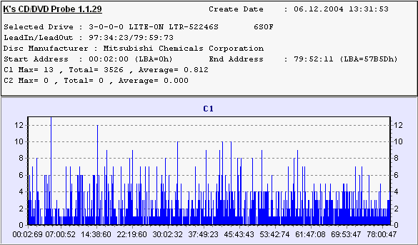 Давайте посмотрим насколько качественно привод записал тестовую болванку. Качество записи мы будем оценивать с помощью программы Kprobe2, которая умеет работать с DL болванками и привода LiteOn 812S.