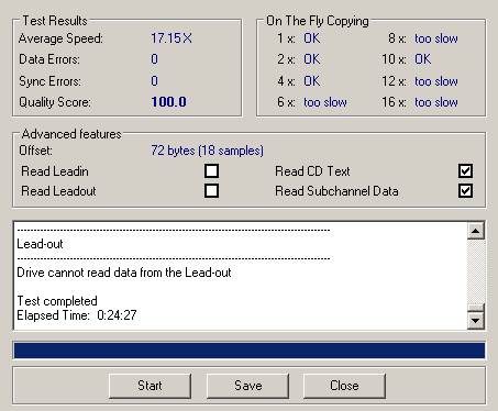 Напоминаем, что подробно и полно с пояснениями к тестируемым параметрам можно ознакомиться непосредственно в «файле помощи» к тестовой программе Nero СD Speed. На случай, если вы не желаете по каким-либо причинам скачивать саму утилиту, мы выложили HTML-файл помощи тестовой утилиты здесь. DAE Quality (EAC)Этот тест разработан создателем программы EAC, называется он DAE Quality, а его описание находится здесь. Если коротко, то этот тест позволяет измерить качество извлечения аудиоданных и качество обработки ошибок С2 с помощью специально изготовленного тестового диска. В данном случае измерить значение С2 не представилось возможным.