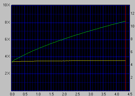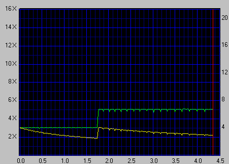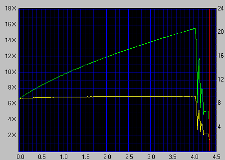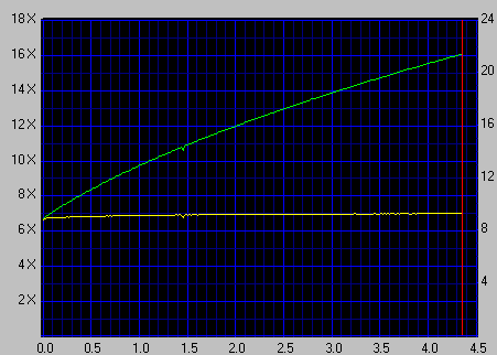Уровень ошибок при контрольном считывании достаточно невысокий, записанные диски уверенно читались большинством устройств, а воспроизведение DVD видео на бытовом плеере прошло без каких либо дефектов звука и изображения. Запись дисков DVD+RТеперь перейдем к тестам записи DVD+R дисков, при записи этого типа носителей привод может развивать скорость до 8х. При записи DVD+R дисков на скорости выше 2.4х привод использует технологию Z-CLV, а вот так процесс записи выглядит в графическом виде.