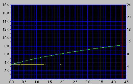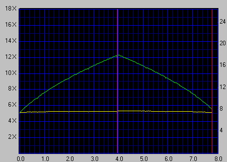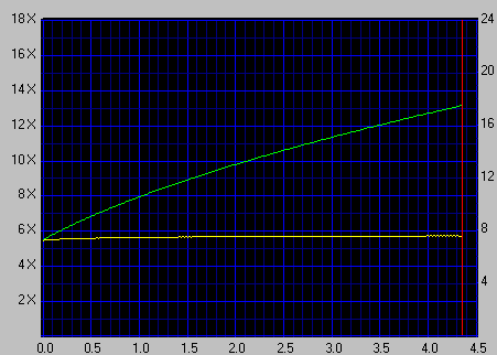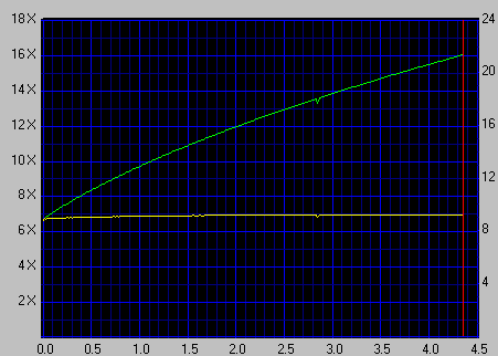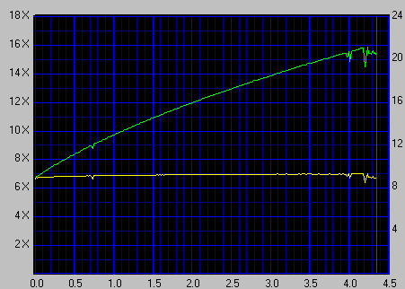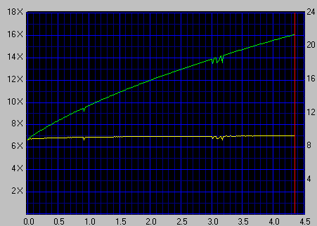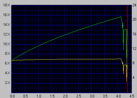 Приведенный скриншот представляет собой наиболее типичную картину записи различных носителей. Для записи на максимальной скорости используется технология CAV, а при записи на более низкой скорости используется технология P-CAV. Традиционно проводилось тестирование привода на способность корректно запиcывать цианиновые диски на минимальной скорости, такой режим чаще всего применяют меломаны, чтобы добиться максимально качественного звучания.
