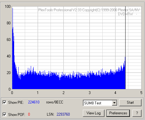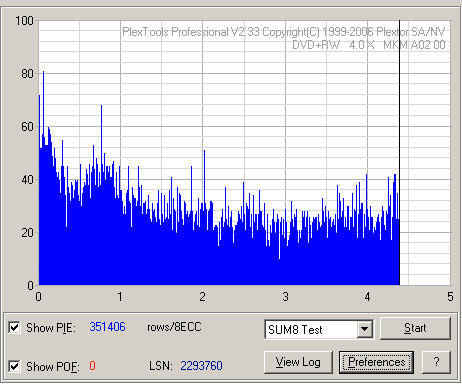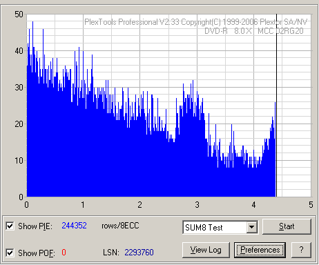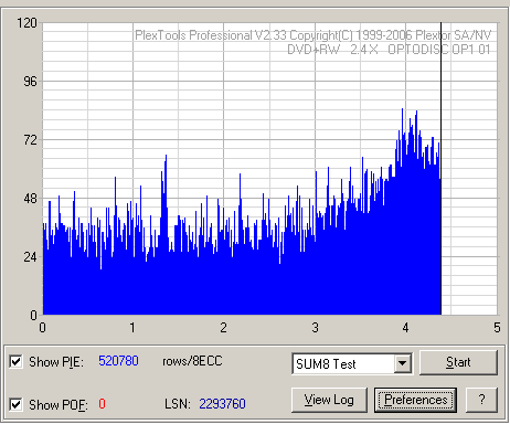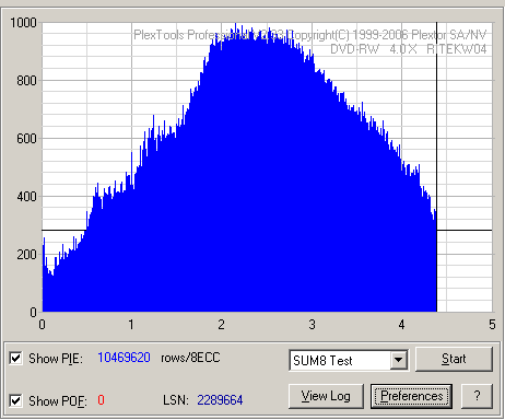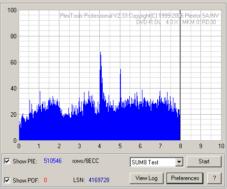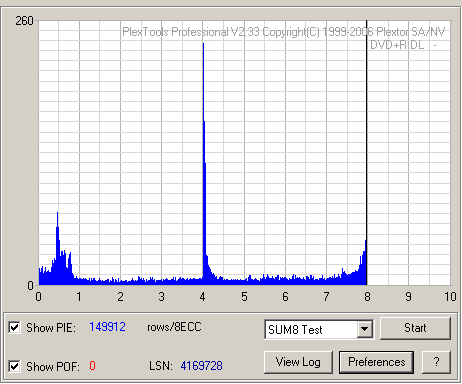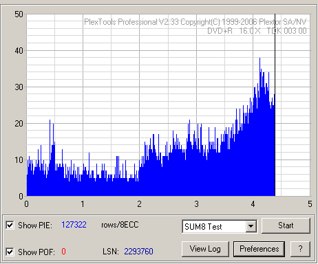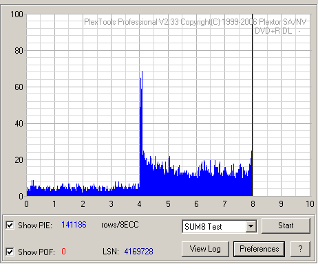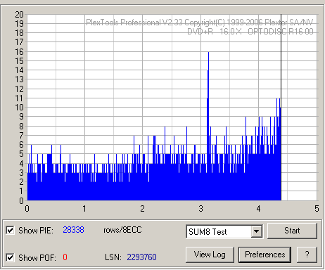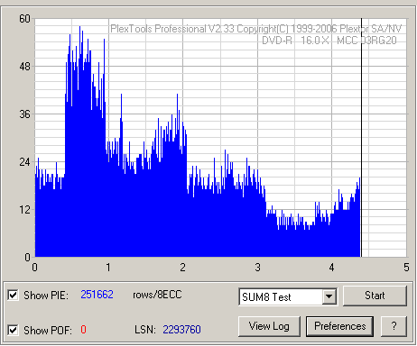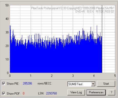 Привод позволяет записывать часть качественных DVD дисков выше номинала. К сожалению, на данный момент на рынке практически нет DVD+R рассчитанных на скорость записи 18х, но пользователи могут записывать на этой скорости небольшое количество болванок рассчитанных на скорость 16х. Подробный список болванок и скорости, на которых они могут быть записаны, можно найти на сайте Plextor. Разница во времени, при записи болванок Verbatim на скорости 18х и скорости 16х, оказалась незначительной и составила 10-15 секунд. Теперь, посмотрим немного результатов тестирования различных болванок формата DVD+R чтобы оценить качество записи.
