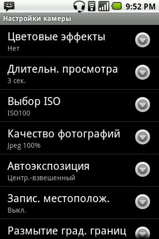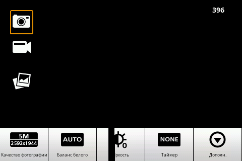 После ознакомления с качеством полученных фотографий становится понятно, что настройки камеры не смогут изменить общую картину. Однако их стоит перечислить. На основном экране программы управления камерой находятся иконки переключения режима работы, а также открытия альбома со снимками. В нижней части экрана находится ползунок цифрового «зума». В верхней части окна находится индикатор, информирующий о количестве оставшейся памяти в виде приблизительного доступного числа снимков или длительности видеоролика. Все остальные настройки камеры вынесены в отдельное меню. Среди них: разрешение съемки, баланс белого, яркость, установка таймера, цветовые эффекты, формат видео и прочее.