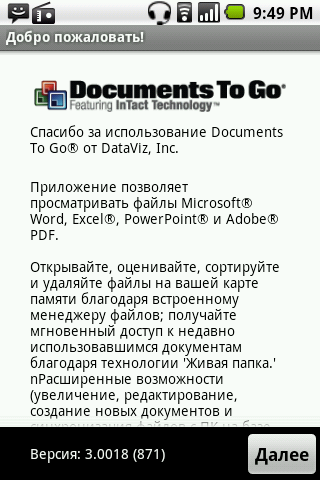 Программа DocsToGo позволяет просматривать и редактировать «на ходу» документы в популярном формате Microsoft Office и PDF. Приложение RoadSync того же производителя обеспечивает возможность работы с серверами Microsoft Exchange.