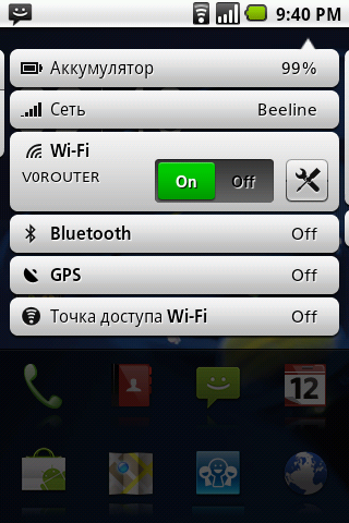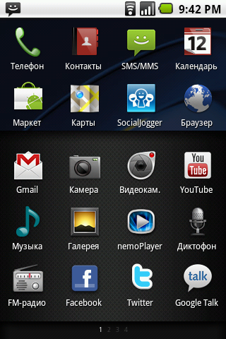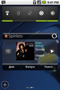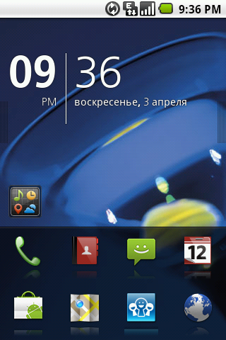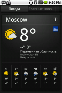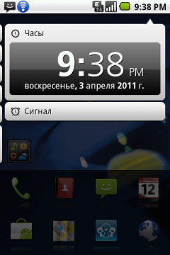 С наполнением основного экрана коммуникатора дело обстоит следующим образом. В верхней части окна находится стандартная строка состояния с часами, иконками аккумуляторной батареи, сигнала сети и уведомлений. Однако, вместо выпадающего стандартного списка уведомлений, при её открытии появляются панели с расшифровками каждого конкретного сообщения и параметра. Передвигаться между ними можно двигая пальцем влево и вправо. Таким способом, не покидая выпадающего меню, можно установить будильник, изменить параметры работы беспроводных сетей, очистить очередь уведомлений, управлять аудиоплеером и много чего еще. Насколько это удобней обычного выпадающего меню Android — вопрос открытый.
