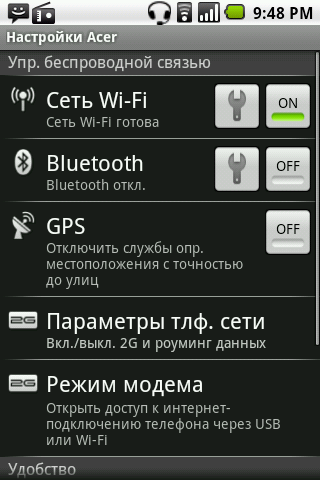 В общем, фирменная оболочка Acer получилась интересной, но не до конца продуманной, требующей привыкания к логике работы и расположению меню. К счастью, разработчики оставили возможность переключения к обычному виду основного окна системы Android, которое выполняется одним нажатием кнопки и требует перезагрузки мобильного компьютера.