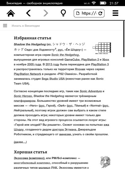 А еще у Amazon Kindle есть «экспериментальный браузер». В 44 странах мира любой пользователь Kindle с 3G может пользоваться мобильным интернетом со своего устройства абсолютно бесплатно. Все необходимое уже встроено в саму книжку. К сожалению, Россия в этот список не входит — для нас бесплатный мобильный интернет ограничен магазином Amazon и Википедией.