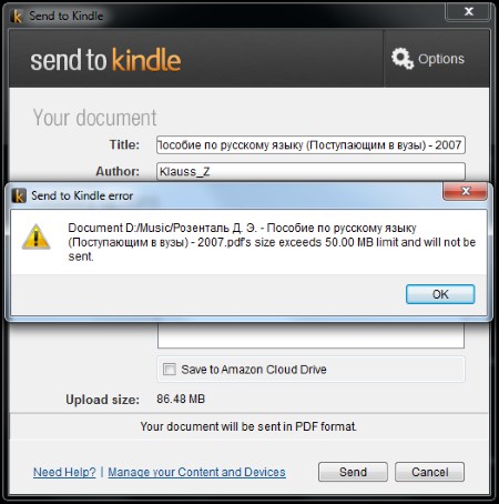 Список форматов, поддерживаемых Kindle «из коробки», не включает распространенный FB2, а также EPUB. Магазин Amazon просто не работает с этими форматами, а в «пиратских» сценариях использования интернет-гигант, разумеется, не заинтересован. Чтобы скопировать документы на Kindle, достаточно подсоединить устройство к ПК и воспользоваться папкой documents. Странно, но этот элементарный способ копирования заработал у нас не сразу, что дало возможность изучить специальную программу Send to Kindle, также предназначенную для этой цели. После установки она пропишется в контекстном меню и будет легко доступна. Если вы, конечно, выбрали файл поддерживаемого формата.