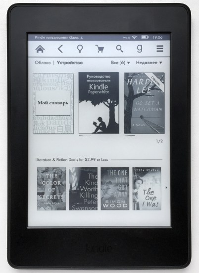 Большую часть главной страницы Kindle занимает два ряда книжных обложек. В верхнем, более крупном расставлены либо книжки, которые есть на устройстве, либо те, что сохранены в облаке Amazon — в зависимости от положения переключателя. Нижний ряд — это витрина Amazon, где выставляются тематические подборки. Он обновляется при каждом удобном случае. Контент сортируется по рубрике (книги, периодика, документы, коллекции), а также по времени, названию и автору. В виде обложек в верхний ряд помещается только три книжки. Через меню можно переключиться на отображение контента в виде списка.