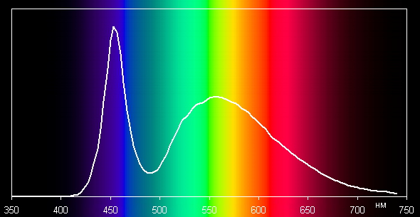 При выводе белого поля максимальное значение яркости составило 91 кд/м², минимальное — 0,06 кд/м². С учетом того, что подсветка фактически нужна только при использовании устройства почти в полной темноте, диапазон значений яркости вполне достаточный. С нашей точки зрения, при максимальном значении настройки яркости (а это 24 по шкале) для условий полной или почти полной темноты яркость несколько избыточна. В этих же условиях установка на 12 по шкале (что соответствует примерно 11 кд/м²) позволяет читать с относительным комфортом. 6 единиц на шкале (0,8 кд/м²) — что-то разглядеть можно, но напрягать глаза приходится очень и очень сильно. 0 на шкале по началу воспринимается как полное отключение подсветки, но на самом деле она работает и обеспечивает яркость экрана на уровне 0,06 кд/м². Зачем это сделано и почему подсветка просто не отключается, не совсем понятно, так как использовать это устройство в полной темноте с такой яркостью экрана физически невозможно. На любом уровне яркости нет значимой модуляции подсветки, поэтому никакого мерцания экрана на практике нет. Спектр подсветки характерен для светодиодов с синим излучателем и желтым люминофором: