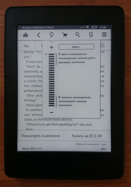 Снимок выше сделан без вспышки и прямого освещения днем в офисе. Шкала яркости включает 24 уровня. Автоматической регулировки не предусмотрено. Поддерживается 16 градаций серого. Отдельно стоит отметить скорость реакции сенсора — здесь Kindle далеко впереди многих других читалок и, скорее, даже ближе к обычным планшетам.