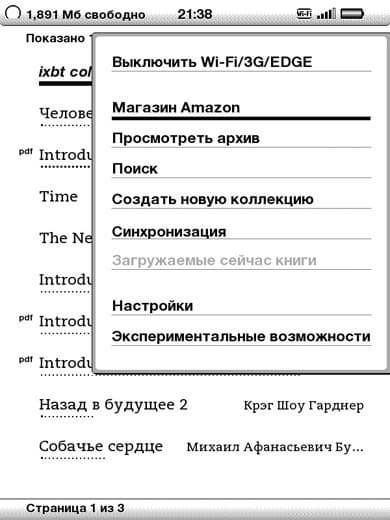 Kindle же может проработать меньше заявленного при частом использовании Wi-Fi или 3G, поэтому если они не используются, их следует выключать — благо чтобы это сделать, не требуется лезть далеко в настройки, все «выключатели» находятся близко, в контекстном меню. Но даже с включенным Wi-Fi специально заряжать его в течение месяца не приходилось. Впрочем, как и Onyx.