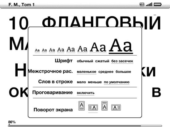 Очень удобно, что при выделении какого-либо пункта в этих настройках сразу же меняется текст на фоне, и становится ясно, оставить ли сделанные изменения. Визуально отображена иерархия размеров шрифтов — от самого малого до самого большого из возможных. Настраивается отображение шрифта — есть варианты с засечками, обычный и сжатый. При этом сам шрифт менять штатными средствами невозможно. Настраиваются поля вокруг текста, а также межстрочное расстояние. Все эти настройки изменяют верстку текста в пределах разумного, без фанатизма, текст остается похожим на печатную книгу. Можно менять ориентацию экрана.