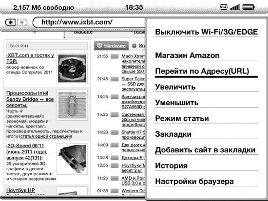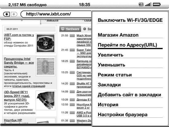 Из экспериментальных функций веб-браузер — наиболее завершенная. Он годится для срочного поиска чего-либо, для проверки почты и т. п., но не факт, что его удобно использовать для чтения. Если не увеличивать страницу, буквы слишком мелкие и иногда не читабельны. Если увеличить, появляется необходимость прокрутки, что в случае с E-Ink-экраном, как мы уже не раз замечали, утомительное занятие. Спасает в данном случае функция чтения статей, которая автоматически выделяет из страницы основное содержимое и показывает его в удобочитаемой форме. Но не на всех страницах эта функция будет работать корректно — зависит от HTML-верстки. Браузер поддерживает Javascript, есть возможность делать закладки. Благодаря хардверной клавиатуре набирать адреса в адресной строке очень удобно. Немаловажно, что можно скачивать с любых сайтов файлы поддерживаемых форматов, но почему-то не всех — только TXT, MOBI, PRC и AZW (за бортом остались RTF и PDF, которые книга способна отображать без конвертации).