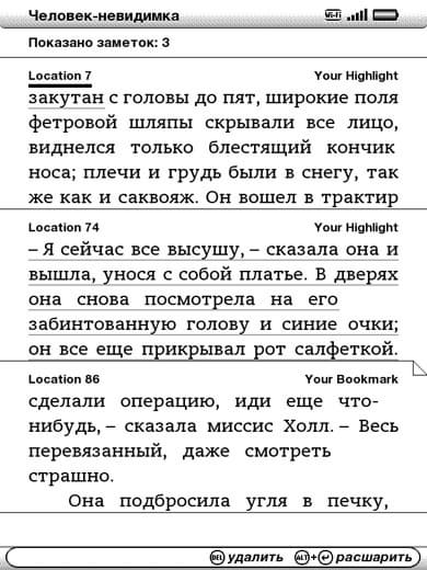 Интересна и удобна возможность создания закладок. Можно просто создать закладку на страницу книги, а можно выделить какую-то часть текста — и в дальнейшем при чтении этот кусок будет подсчечен серым цветом. Пункт «Мои заметки» в меню опций хранит как просто ссылки на страницы с закладками, так и список страниц, на которых вы что-либо выделили, причем в обоих случаях кроме номера страницы отображается часть сопутствующего текста, чтобы было удобнее находить нужную закладку.
