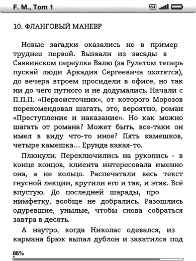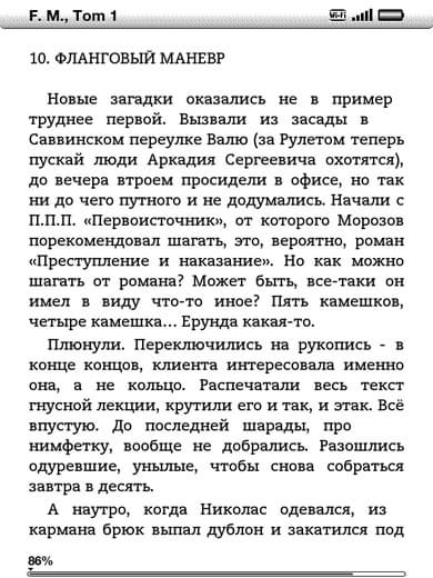 Как видим, текст выглядит довольно приятно — имеются отступы от краев экрана, внизу отображается ненавязчивая полоса прогресса и цифровое обозначение прочитанного в процентах.